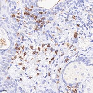 IHC检测CD4蛋白(货号 GB15064). 样品: 小鼠发炎皮肤, 4%多聚甲醛 (货号G1101) 固定12-24小时. 抗原修复: Tris-EDTA抗原修复液 (pH 9.0) (G1203), 98℃, 20分钟. —抗: 1: 400稀释, 4℃ 孵育过夜. 二抗: HRP标记山羊抗兔IgG (H+L) (货号GB23303), 1: 200稀释, 室温孵育1小时. |