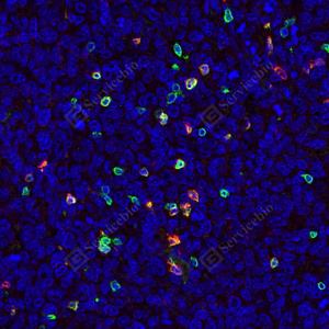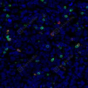 IF analysis of CD4(GB15064) red. sample: Mouse spleen, 4% PFA (G1101) 12-24h. Antigen retrieval: Citrate buffer (pH 6.0) (G1201), pressure cooker 2 min. Blocking buffer: 3% BSA in PBS (GC305010), RT, 30min. Primary antibody: CD4(GB15064) red 1: 500, 4℃ overnight.Cy3 conjugated Goat Anti-Rabbit IgG (H+L) (GB21303), 1: 300, RT, 1h. CD3 (GB12014) green 1: 500, 4℃ overnight,488 conjugated Goat Anti-Mouse IgG (H+L)(GB25301), 1: 400, RT, 1h. |