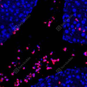 IF检测Ly6g蛋白(货号 GB12229)(红色). 样品: 小鼠LPS诱导(6h)肝脏炎症模型, 4%多聚甲醛 (货号G1101) 固定12-24小时. 抗原修复: 柠檬酸抗原修复液(干粉, pH 6.0) (G1201), 高压锅均匀喷气计时2分钟. 封闭: 3% BSA(货号GC305010)的PBS溶液, 室温孵育30分钟. —抗: 1: 1000稀释, 4℃ 孵育过夜. 二抗: Cy3标记山羊抗大鼠IgG (H+L) (货号GB21302), 1: 300稀释, 室温孵育1小时. |