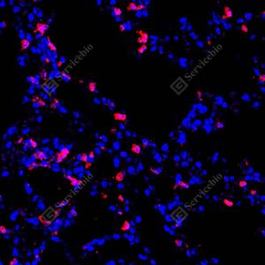 IF检测Ly6g蛋白(货号 GB12229)(红色). 样品: 小鼠LPS诱导(24h)肺部炎症模型, 4%多聚甲醛 (货号G1101) 固定12-24小时. 抗原修复: 柠檬酸抗原修复液(干粉, pH 6.0) (G1201), 高压锅均匀喷气计时2分钟. 封闭: 3% BSA(货号GC305010)的PBS溶液, 室温孵育30分钟. —抗: 1: 1000稀释, 4℃ 孵育过夜. 二抗: Cy3标记山羊抗大鼠IgG (H+L) (货号GB21302), 1: 300稀释, 室温孵育1小时. |