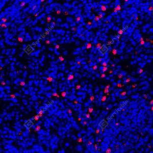 IF检测Ly6g蛋白(货号 GB12229)(红色). 样品: 小鼠脾, 4%多聚甲醛 (货号G1101) 固定12-24小时. 抗原修复: 柠檬酸抗原修复液(干粉, pH 6.0) (G1201), 高压锅均匀喷气计时2分钟. 封闭: 3% BSA(货号GC305010)的PBS溶液, 室温孵育30分钟. —抗: 1: 1000稀释, 4℃ 孵育过夜. 二抗: Cy3标记山羊抗大鼠IgG (H+L) (货号GB21302), 1: 300稀释, 室温孵育1小时. |