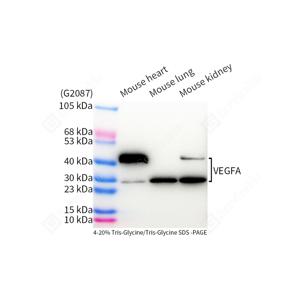 | WB检测VEGFA蛋白(货号 GB15034). 样品: 经RIPA裂解液(货号G2002)处理的蛋白质. 封闭: 3%脱脂牛奶(货号GC310001)溶于TBST溶液, 室温孵育1小时. —抗: 1: 1000稀释, 4℃ 孵育过夜. 二抗: HRP标记山羊抗小鼠IgG (H+L) (货号GB23301), 1: 5000稀释, 室温孵育1小时. |