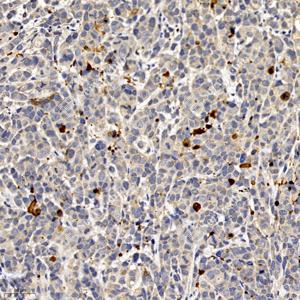 IHC检测Cleaved-Caspase-3蛋白(货号 GB11532). 样品: 小鼠皮下移植瘤, 4%多聚甲醛 (货号G1101) 固定12-24小时. 抗原修复: 柠檬酸抗原修复液(干粉, pH 6.0) (G1201), 98℃, 20分钟. —抗: 1: 600稀释, 4℃ 孵育过夜. 二抗: HRP标记山羊抗兔IgG (H+L) (货号GB23303), 1: 200稀释, 室温孵育1小时. |