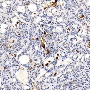 IHC检测Cleaved-Caspase-3蛋白(货号 GB11532). 样品: 人皮下移植瘤, 4%多聚甲醛 (货号G1101) 固定12-24小时. 抗原修复: 柠檬酸抗原修复液(干粉, pH 6.0) (G1201), 98℃, 20分钟. —抗: 1: 600稀释, 4℃ 孵育过夜. 二抗: HRP标记山羊抗兔IgG (H+L) (货号GB23303), 1: 200稀释, 室温孵育1小时. |