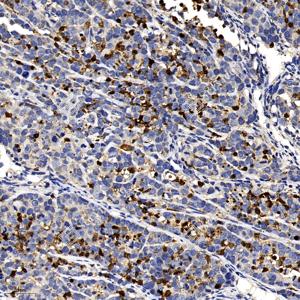 IHC检测Cleaved-Caspase-3蛋白(货号 GB11532). 样品: 人胃癌, 4%多聚甲醛 (货号G1101) 固定12-24小时. 抗原修复: 柠檬酸抗原修复液(干粉, pH 6.0) (G1201), 98℃, 20分钟. —抗: 1: 600稀释, 4℃ 孵育过夜. 二抗: HRP标记山羊抗兔IgG (H+L) (货号GB23303), 1: 200稀释, 室温孵育1小时. |