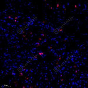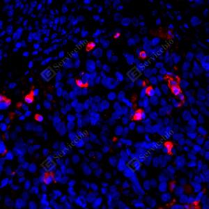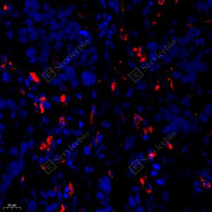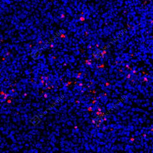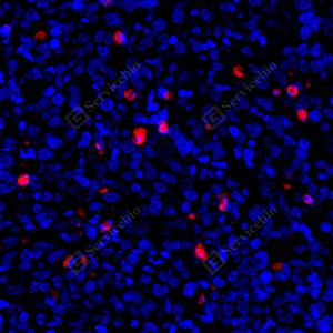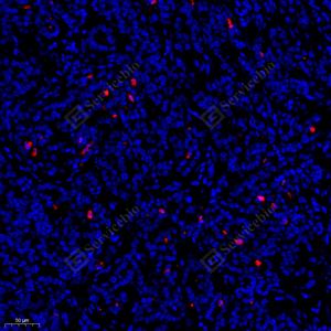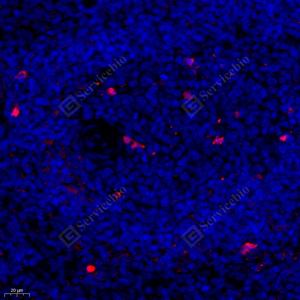 IF检测Cleaved-Caspase-3蛋白(货号 GB11532)(红色). 样品: 小鼠脾, 4%多聚甲醛 (货号G1101) 固定12-24小时. 抗原修复: Tris-EDTA抗原修复液 (pH 9.0) (G1203), 98℃, 20分钟. 封闭: 3% BSA(货号GC305010)的PBS溶液, 室温孵育30分钟. —抗: 1: 500, 4℃ 孵育过夜. 二抗: Cy3标记山羊抗兔IgG (H+L) (货号GB21303), 1: 300稀释, 室温孵育1小时. |