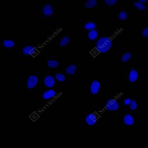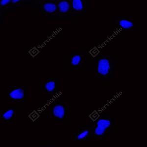 ICC检测Cleaved-Caspase-3蛋白(货号 GB11532)(红色). 样品: HeLa细胞星孢菌素0小时, 4%多聚甲醛 (货号G1101) 固定20分钟. 封闭: 3% BSA(货号GC305010)的PBS溶液, 室温孵育30分钟. —抗: 1: 500稀释, 4℃ 孵育过夜. 二抗: Cy3标记山羊抗兔IgG (H+L) (货号GB21303), 1: 300稀释, 室温孵育1小时. |
