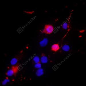 ICC检测Cleaved-Caspase-3蛋白(货号 GB11532)(红色). 样品: C2C12细胞, 4%多聚甲醛 (货号G1101) 固定20分钟. 封闭: 3% BSA(货号GC305010)的PBS溶液, 室温孵育30分钟. —抗: 1: 500稀释, 4℃ 孵育过夜. 二抗: Cy3标记山羊抗兔IgG (H+L) (货号GB21303), 1: 300稀释, 室温孵育1小时. |
