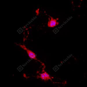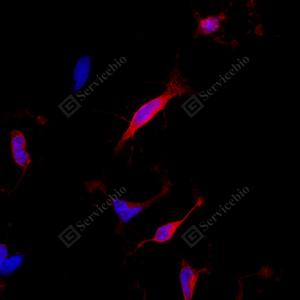 ICC检测Cleaved-Caspase-3蛋白(货号 GB11532)(红色). 样品: L6细胞, 4%多聚甲醛 (货号G1101) 固定20分钟. 封闭: 3% BSA(货号GC305010)的PBS溶液, 室温孵育30分钟. —抗: 1: 500稀释, 4℃ 孵育过夜. 二抗: Cy3标记山羊抗兔IgG (H+L) (货号GB21303), 1: 300稀释, 室温孵育1小时. |