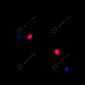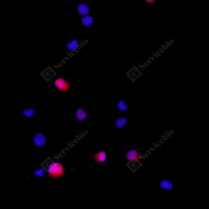 ICC检测Cleaved-Caspase-3蛋白(货号 GB11532)(红色). 样品: HeLa细胞星孢菌素3小时, 4%多聚甲醛 (货号G1101) 固定20分钟. 封闭: 3% BSA(货号GC305010)的PBS溶液, 室温孵育30分钟. —抗: 1: 500稀释, 4℃ 孵育过夜. 二抗: Cy3标记山羊抗兔IgG (H+L) (货号GB21303), 1: 300稀释, 室温孵育1小时. |