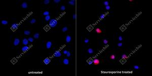 ICC检测Cleaved-Caspase-3蛋白(货号 GB11532)(红色). 样品: L6星孢菌素6小时, 4%多聚甲醛 (货号G1101) 固定20分钟. 封闭: 3% BSA(货号GC305010)的PBS溶液, 室温孵育30分钟. —抗: 1: 500稀释, 4℃ 孵育过夜. 二抗: Cy3标记山羊抗兔IgG (H+L) (货号GB21303), 1: 300稀释, 室温孵育1小时. |