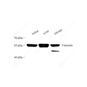 WB检测Vimentin蛋白(货号 GB121308). 样品: 经RIPA裂解液(货号G2002)处理的蛋白质. 封闭: 3%脱脂牛奶(货号GC310001)溶于TBST溶液, 室温孵育1小时. —抗: 1: 1000稀释, 4℃ 孵育过夜. 二抗: HRP标记山羊抗小鼠IgG (H+L) (货号GB23301), 1: 5000稀释, 室温孵育1小时. |