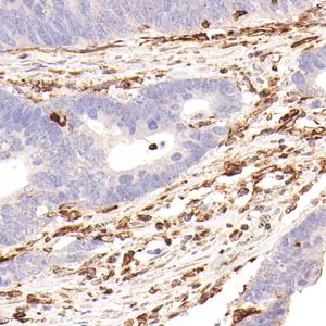 IHC检测Vimentin蛋白(货号 GB121308). 样品: 人结肠癌, 4%多聚甲醛 (货号G1101) 固定12-24小时. 抗原修复: 柠檬酸抗原修复液(干粉, pH 6.0) (G1201), 高压锅均匀喷气计时2分钟. —抗: 1: 1000稀释, 4℃ 孵育过夜. 二抗: HRP标记山羊抗小鼠IgG (H+L) (货号GB23301), 1: 200稀释, 室温孵育1小时. |