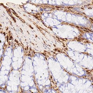 IHC检测Vimentin蛋白(货号 GB121308). 样品: 大鼠结肠, 4%多聚甲醛 (货号G1101) 固定12-24小时. 抗原修复: 柠檬酸抗原修复液(干粉, pH 6.0) (G1201), 高压锅均匀喷气计时2分钟. —抗: 1: 1000稀释, 4℃ 孵育过夜. 二抗: HRP标记山羊抗小鼠IgG (H+L) (货号GB23301), 1: 200稀释, 室温孵育1小时. |