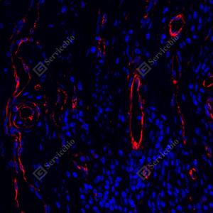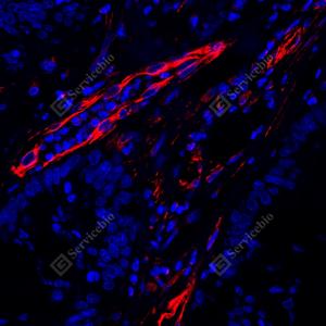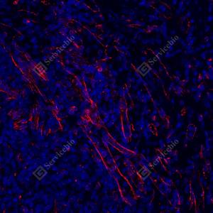 IF检测Vimentin蛋白(货号 GB121308)(红色). 样品: 大鼠脾, 4%多聚甲醛 (货号G1101) 固定12-24小时. 抗原修复: 柠檬酸抗原修复液(干粉, pH 6.0) (G1201), 高压锅均匀喷气计时2分钟. 封闭: 3% BSA(货号GC305010)的PBS溶液, 室温孵育30分钟. —抗: 1: 500稀释, 4℃ 孵育过夜. 二抗: Cy3标记山羊抗小鼠IgG (H+L) (货号GB21301), 1: 300稀释, 室温孵育1小时. |