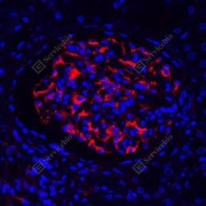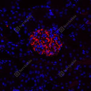 IF检测Vimentin蛋白(货号 GB121308)(红色). 样品: 大鼠肾, 4%多聚甲醛 (货号G1101) 固定12-24小时. 抗原修复: 柠檬酸抗原修复液(干粉, pH 6.0) (G1201), 高压锅均匀喷气计时2分钟. 封闭: 3% BSA(货号GC305010)的PBS溶液, 室温孵育30分钟. —抗: 1: 500稀释, 4℃ 孵育过夜. 二抗: Cy3标记山羊抗小鼠IgG (H+L) (货号GB21301), 1: 300稀释, 室温孵育1小时. |