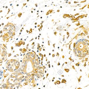 IHC检测Vimentin蛋白(货号 GB111308). 样品: 人乳腺癌, 4%多聚甲醛 (货号G1101) 固定12-24小时. 抗原修复: 柠檬酸抗原修复液(干粉, pH 6.0) (G1201), 98℃, 20分钟. —抗: 1: 1500稀释, 4℃ 孵育过夜. 二抗: HRP标记山羊抗兔IgG (H+L) (货号GB23303), 1: 200稀释, 室温孵育1小时. |