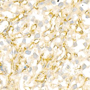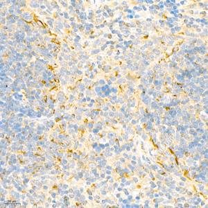 IHC检测Vimentin蛋白(货号 GB111308). 样品: 大鼠淋巴, 4%多聚甲醛 (货号G1101) 固定12-24小时. 抗原修复: 柠檬酸抗原修复液(干粉, pH 6.0) (G1201), 98℃, 20分钟. —抗: 1: 1500稀释, 4℃ 孵育过夜. 二抗: HRP标记山羊抗兔IgG (H+L) (货号GB23303), 1: 200稀释, 室温孵育1小时. |