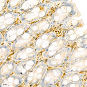 IHC检测Vimentin蛋白(货号 GB111308). 样品: 大鼠结肠, 4%多聚甲醛 (货号G1101) 固定12-24小时. 抗原修复: 柠檬酸抗原修复液(干粉, pH 6.0) (G1201), 98℃, 20分钟. —抗: 1: 1500稀释, 4℃ 孵育过夜. 二抗: HRP标记山羊抗兔IgG (H+L) (货号GB23303), 1: 200稀释, 室温孵育1小时. |