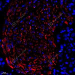 IF检测Vimentin蛋白(货号 GB111308)(红色). 样品: 人卵巢癌, 4%多聚甲醛 (货号G1101) 固定12-24小时. 抗原修复: Tris-EDTA抗原修复液(pH 9.0) (G1203), 98℃, 20分钟. 封闭: 3% BSA(货号GC305010)的PBS溶液, 室温孵育30分钟. —抗: 1: 1600稀释, 4℃ 孵育过夜. 二抗: Cy3标记山羊抗兔IgG (H+L) (货号GB21303), 1: 300稀释, 室温孵育1小时. |