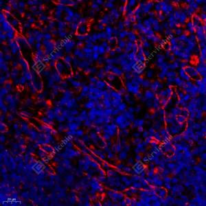 IF检测Vimentin蛋白(货号 GB111308)(红色). 样品: 大鼠脾, 4%多聚甲醛 (货号G1101) 固定12-24小时. 抗原修复: Tris-EDTA抗原修复液(pH 9.0) (G1203), 98℃, 20分钟. 封闭: 3% BSA(货号GC305010)的PBS溶液, 室温孵育30分钟. —抗: 1: 1500稀释, 4℃ 孵育过夜. 二抗: Cy3标记山羊抗兔IgG (H+L) (货号GB21303), 1: 300稀释, 室温孵育1小时. |