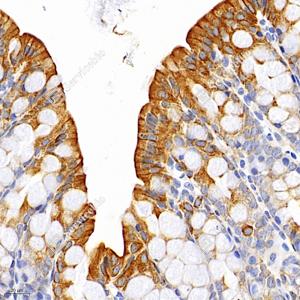 | IHC检测E-cadherin蛋白(货号 GB12083). 样品: 猴十二指肠, 4%多聚甲醛 (货号G1101) 固定12-24小时. 抗原修复: 柠檬酸抗原修复液(干粉, pH 6.0) (G1201), 高压锅均匀喷气计时2分钟. —抗: 1: 1500稀释, 4℃ 孵育过夜. 二抗: HRP标记山羊抗小鼠IgG (H+L) (货号GB23301), 1: 200稀释, 室温孵育1小时. |