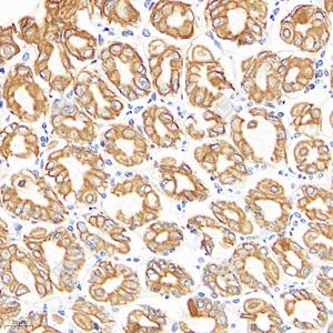 | IHC检测E-cadherin蛋白(货号 GB12083). 样品: 小鼠胃, 4%多聚甲醛 (货号G1101) 固定12-24小时. 抗原修复: 柠檬酸抗原修复液(干粉, pH 6.0) (G1201), 高压锅均匀喷气计时2分钟. —抗: 1: 5000稀释, 4℃ 孵育过夜. 二抗: HRP标记山羊抗小鼠IgG (H+L) (货号GB23301), 1: 200稀释, 室温孵育1小时. |