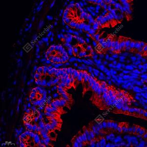 | IF检测E-cadherin蛋白(货号 GB12083)(红色). 样品: 小鼠结肠, 4%多聚甲醛 (货号G1101) 固定12-24小时. 抗原修复: 柠檬酸抗原修复液(干粉, pH 6.0) (G1201), 高压锅均匀喷气计时2分钟. 封闭: 3% BSA(货号GC305010)的PBS溶液, 室温孵育30分钟. —抗: 1: 500稀释, 4℃ 孵育过夜. 二抗: Cy3标记山羊抗小鼠IgG (H+L) (货号GB21301), 1: 300稀释, 室温孵育1小时. |