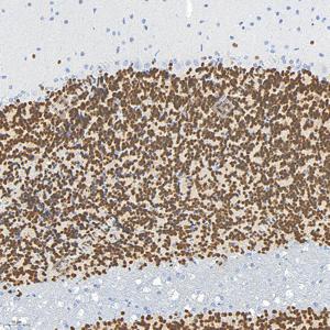 NeuN, encoded by FOX3, is a neuron-specific nuclear protein. Anti-NeuN stains exclusively neuronal cells in the central and peripheral nervous systems, especially postmitotic and differentiating neurons, as well as terminally differentiated neurons. Anti-NeuN has been used widely as a reliable tool to detect most postmitotic neuronal cell types. The immunohistochemical staining is primarily localized in the nucleus of the neurons with lighter staining in the cytoplasm.