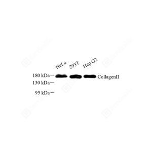 WB检测Collagen II蛋白(货号 GB11021). 样品: 经RIPA裂解液(货号G2002)处理的蛋白质. 封闭: 3%脱脂牛奶(货号GC310001)溶于TBST溶液, 室温孵育1小时. —抗: 1: 1000稀释, 4℃ 孵育过夜. 二抗: HRP标记山羊抗兔IgG (H+L) (货号GB23303), 1: 5000稀释, 室温孵育1小时. |