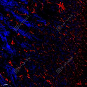 IF检测Collagen II蛋白(货号 GB11021)(红色). 样品: 大鼠骨, 4%多聚甲醛 (货号G1101) 固定12-24小时. 抗原修复: Tris-EDTA抗原修复液(pH 9.0) (G1203), 98℃, 20分钟. 封闭: 3% BSA(货号GC305010)的PBS溶液, 室温孵育30分钟. —抗: 1: 200稀释, 4℃ 孵育过夜. 二抗: Cy3标记山羊抗兔IgG (H+L) (货号GB21303), 1: 300稀释, 室温孵育1小时. |