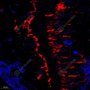 IF检测Collagen II蛋白(货号 GB11021)(红色). 样品: 小鼠骨, 4%多聚甲醛 (货号G1101) 固定12-24小时. 抗原修复: Tris-EDTA抗原修复液(pH 9.0) (G1203), 98℃, 20分钟. 封闭: 3% BSA(货号GC305010)的PBS溶液, 室温孵育30分钟. —抗: 1: 200稀释, 4℃ 孵育过夜. 二抗: Cy3标记山羊抗兔IgG (H+L) (货号GB21303), 1: 300稀释, 室温孵育1小时. |