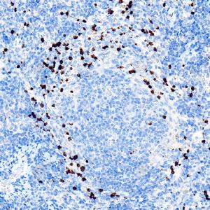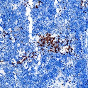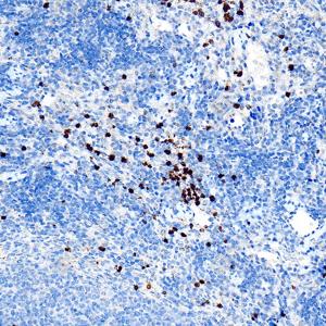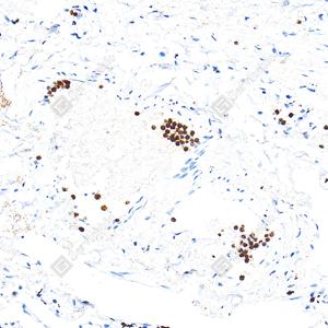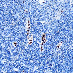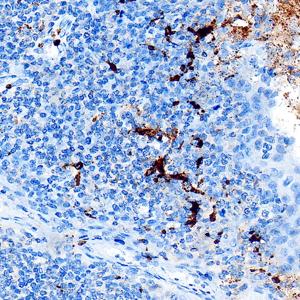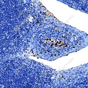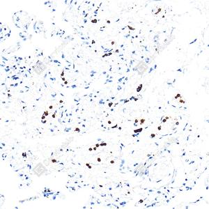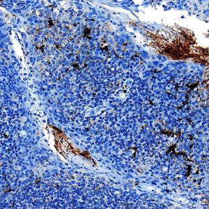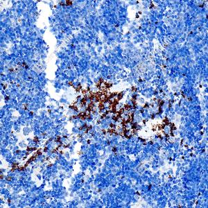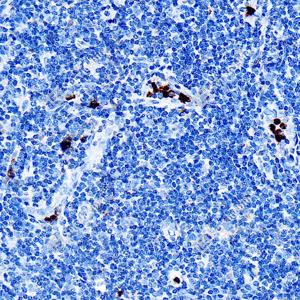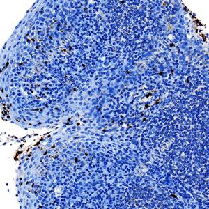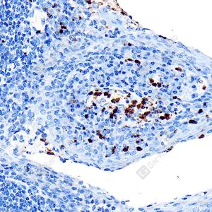 | IHC检测Myeloperoxidase蛋白(货号 GB150145). 样品: 人扁桃体, 4%多聚甲醛 (货号G1101) 固定12-24小时. 抗原修复: 抗原修复仪 (货号 ARI-4),Tris-EDTA抗原修复液(pH 9.0) (货号G1203), 水浴98℃, 20分钟. —抗: 1: 1000稀释, 4℃ 孵育过夜. 二抗: S-vision免疫组化多聚二抗(山羊抗兔),即用型 (货号G1302), 室温孵育20分钟. |