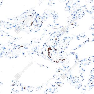 | IHC检测Myeloperoxidase蛋白(货号 GB150145). 样品: 人肺, 4%多聚甲醛 (货号G1101) 固定12-24小时. 抗原修复: 抗原修复仪 (货号 ARI-4),Tris-EDTA抗原修复液(pH 9.0) (货号G1203), 水浴98℃, 20分钟. —抗: 1: 1000稀释, 4℃ 孵育过夜. 二抗: S-vision免疫组化多聚二抗(山羊抗兔),即用型 (货号G1302), 室温孵育20分钟. |