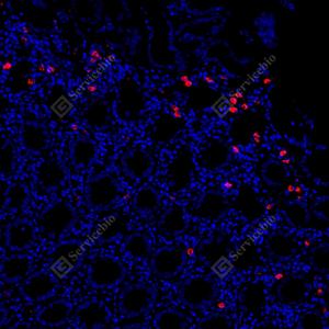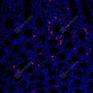 | IF检测Myeloperoxidase蛋白(货号 GB150145)(红色). 样品: 人结肠, 4%多聚甲醛 (货号G1101) 固定12-24小时. 抗原修复: 抗原修复仪 (货号 ARI-4),Tris-EDTA抗原修复液(pH 9.0) (货号G1203), 水浴98℃, 20分钟. 封闭: 3% BSA(货号GC305010)的PBS溶液, 室温孵育30分钟. —抗: 1: 1000稀释, 4℃ 孵育过夜. 二抗: Cy3标记山羊抗兔IgG (H+L) (货号GB21303), 1: 300稀释, 室温孵育1小时. |