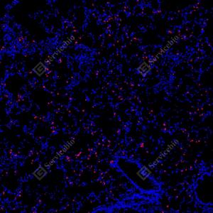 | IF检测Myeloperoxidase蛋白(货号 GB150145)(红色). 样品: 大鼠lps(6h)诱导的肺部炎症模型, 4%多聚甲醛 (货号G1101) 固定12-24小时. 抗原修复: 抗原修复仪 (货号 ARI-4),Tris-EDTA抗原修复液(pH 9.0) (货号G1203), 水浴98℃, 20分钟. 封闭: 3% BSA(货号GC305010)的PBS溶液, 室温孵育30分钟. —抗: 1: 1000稀释, 4℃ 孵育过夜. 二抗: Cy3标记山羊抗兔IgG (H+L) (货号GB21303), 1: 300稀释, 室温孵育1小时. |