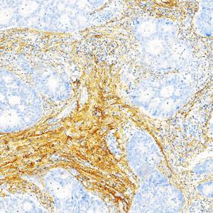 | IHC检测Collagen III蛋白(货号 GB151323). 样品: 人结肠癌, 4%多聚甲醛 (货号G1101) 固定12-24小时. 抗原修复: Tris-EDTA抗原修复液(pH 9.0) (G1203), 100℃, 25分钟. —抗: 1: 500稀释, 4℃ 孵育过夜. 二抗: S-vision免疫组化多聚二抗(山羊抗兔),即用型 (货号G1302), 室温孵育20分钟. |