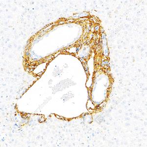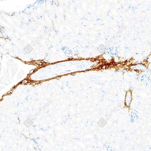| IHC检测Collagen III蛋白(货号 GB151323). 样品: 人肝, 4%多聚甲醛 (货号G1101) 固定12-24小时. 抗原修复: Tris-EDTA抗原修复液(pH 9.0) (G1203), 100℃, 25分钟. —抗: 1: 500稀释, 4℃ 孵育过夜. 二抗: S-vision免疫组化多聚二抗(山羊抗兔),即用型 (货号G1302), 室温孵育20分钟. |
