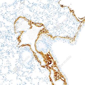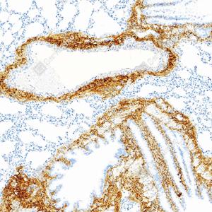 | IHC检测Collagen III蛋白(货号 GB151323). 样品: 小鼠肺, 4%多聚甲醛 (货号G1101) 固定12-24小时. 抗原修复: Tris-EDTA抗原修复液(pH 9.0) (G1203), 100℃, 25分钟. —抗: 1: 500稀释, 4℃ 孵育过夜. 二抗: S-vision免疫组化多聚二抗(山羊抗兔),即用型 (货号G1302), 室温孵育20分钟. |