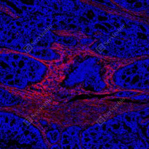 | IF检测Collagen III蛋白(货号 GB151323)(红色). 样品: 人结肠癌, 4%多聚甲醛 (货号G1101) 固定12-24小时. 抗原修复: Tris-EDTA抗原修复液(pH 9.0) (G1203), 100℃, 25分钟. 封闭: 3% BSA(货号GC305010)的PBS溶液, 室温孵育30分钟. —抗: 1: 500稀释, 4℃ 孵育过夜. 二抗: Cy3标记山羊抗兔IgG (H+L) (货号GB21303), 1: 300稀释, 室温孵育1小时. |