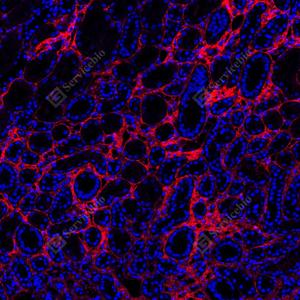 | IF检测Collagen III蛋白(货号 GB151323)(红色). 样品: 人肾, 4%多聚甲醛 (货号G1101) 固定12-24小时. 抗原修复: Tris-EDTA抗原修复液(pH 9.0) (G1203), 100℃, 25分钟. 封闭: 3% BSA(货号GC305010)的PBS溶液, 室温孵育30分钟. —抗: 1: 500稀释, 4℃ 孵育过夜. 二抗: Cy3标记山羊抗兔IgG (H+L) (货号GB21303), 1: 300稀释, 室温孵育1小时. |