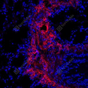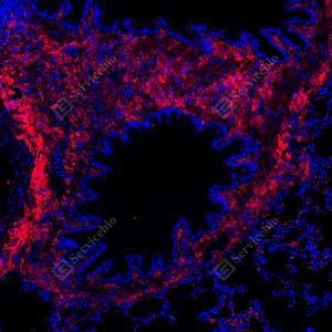 | IF检测Collagen III蛋白(货号 GB151323)(红色). 样品: 小鼠肺, 4%多聚甲醛 (货号G1101) 固定12-24小时. 抗原修复: Tris-EDTA抗原修复液(pH 9.0) (G1203), 100℃, 25分钟. 封闭: 3% BSA(货号GC305010)的PBS溶液, 室温孵育30分钟. —抗: 1: 500稀释, 4℃ 孵育过夜. 二抗: Cy3标记山羊抗兔IgG (H+L) (货号GB21303), 1: 300稀释, 室温孵育1小时. |