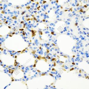 IHC检测MMP9蛋白(货号 GB15132). 样品: 小鼠LPS诱导(6h)肺部炎症模型, 4%多聚甲醛 (货号G1101) 固定12-24小时. 抗原修复: 柠檬酸抗原修复液(干粉, pH 6.0) (G1201), 高压锅均匀喷气计时2分钟. —抗: 1: 1000稀释, 4℃ 孵育过夜. 二抗: HRP标记山羊抗小鼠IgG (H+L) (货号GB23301), 1: 200稀释, 室温孵育1小时. |