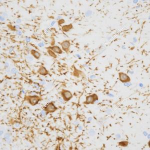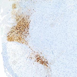 IHC检测Tyrosine Hydroxylase蛋白(货号 GB15182). 样品: 小鼠黑质(帕金森病), 4%多聚甲醛 (货号G1101) 固定12-24小时. 抗原修复: Tris-EDTA抗原修复液(pH 9.0) (G1203), 98℃, 20分钟. —抗: 1: 500稀释, 4℃ 孵育过夜. 二抗: HRP标记山羊抗兔IgG (H+L) (货号GB23303), 1: 200稀释, 室温孵育1小时. |