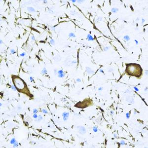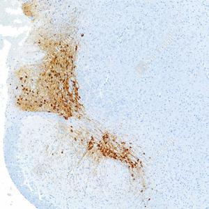 IHC检测Tyrosine Hydroxylase蛋白(货号 GB15182). 样品: 大鼠脑, 4%多聚甲醛 (货号G1101) 固定12-24小时. 抗原修复: Tris-EDTA抗原修复液(pH 9.0) (G1203), 98℃, 20分钟. —抗: 1: 1000稀释, 4℃ 孵育过夜. 二抗: HRP标记山羊抗兔IgG (H+L) (货号GB23303), 1: 200稀释, 室温孵育1小时. |