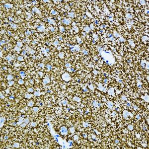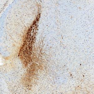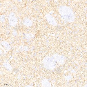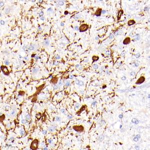 IHC检测Tyrosine Hydroxylase蛋白(货号 GB11181). 样品: 小鼠黑质(帕金森病), 4%多聚甲醛 (货号G1101) 固定12-24小时. 抗原修复: 柠檬酸抗原修复液(干粉, pH 6.0) (G1201), 98℃, 20分钟. —抗: 1: 1000稀释, 4℃ 孵育过夜. 二抗: HRP标记山羊抗兔IgG (H+L) (货号GB23303), 1: 200稀释, 室温孵育1小时. |