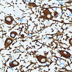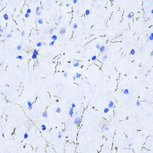 IHC检测Tyrosine Hydroxylase蛋白(货号 GB11181). 样品: 小鼠纹状体(帕金森病), 4%多聚甲醛 (货号G1101) 固定12-24小时. 抗原修复: 柠檬酸抗原修复液(干粉, pH 6.0) (G1201), 98℃, 20分钟. —抗: 1: 1000稀释, 4℃ 孵育过夜. 二抗: HRP标记山羊抗兔IgG (H+L) (货号GB23303), 1: 200稀释, 室温孵育1小时. |