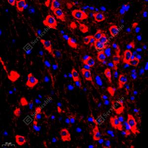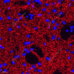 IF检测Tyrosine Hydroxylase蛋白(货号 GB11181)(红色). 样品: 小鼠纹状体, 4%多聚甲醛 (货号G1101) 固定12-24小时. 抗原修复: Tris-EDTA抗原修复液(pH 9.0) (G1203), 98℃, 20分钟. 封闭: 3% BSA(货号GC305010)的PBS溶液, 室温孵育30分钟. —抗: 1: 500稀释, 4℃ 孵育过夜. 二抗: Cy3标记山羊抗兔IgG (H+L) (货号GB21303), 1: 300稀释, 室温孵育1小时. |