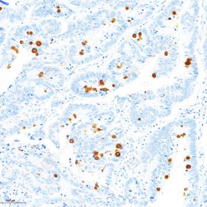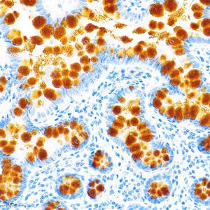 IHC检测MUC2蛋白(货号 GB15344). 样品: 人结肠癌, 4%多聚甲醛 (货号G1101) 固定12-24小时. 抗原修复: 柠檬酸抗原修复液(干粉, pH 6.0) (G1201), 高压锅均匀喷气计时2分钟. —抗: 1: 1000稀释, 4℃ 孵育过夜. 二抗: S-vision免疫组化多聚二抗(山羊抗兔),即用型 (货号G1302), 室温孵育20分钟. |