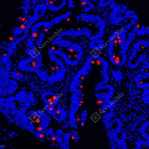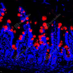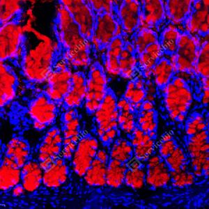 IF检测MUC2蛋白(货号 GB15344)(红色). 样品: 小鼠小肠, 4%多聚甲醛 (货号G1101) 固定12-24小时. 抗原修复: 柠檬酸抗原修复液(干粉, pH 6.0) (G1201), 高压锅均匀喷气计时2分钟. 封闭: 3% BSA(货号GC305010)的PBS溶液, 室温孵育30分钟. —抗: 1: 1000稀释, 4℃ 孵育过夜. 二抗: Cy3标记山羊抗兔IgG (H+L) (货号GB21303), 1: 300稀释, 室温孵育1小时. |